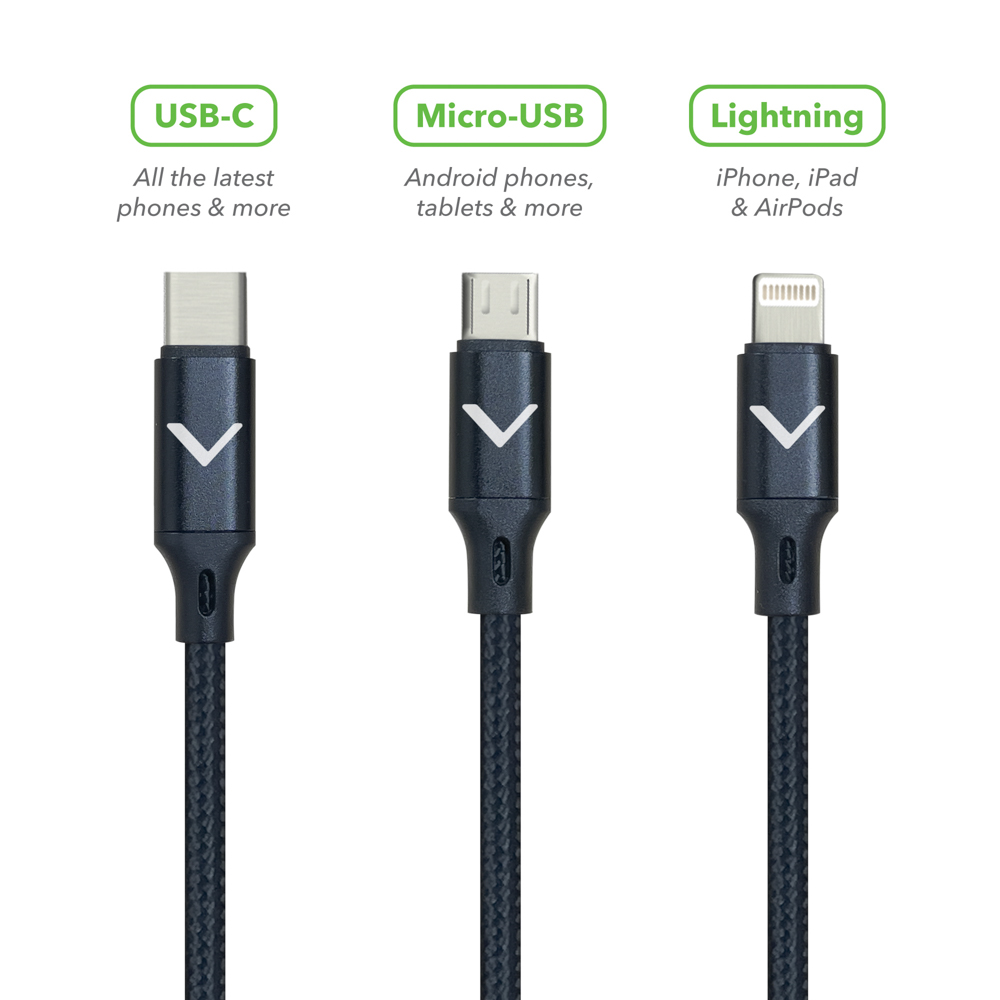 Always have the right cable with you, with 3 different connectors covering most phones, tablets, headphones and other devices.