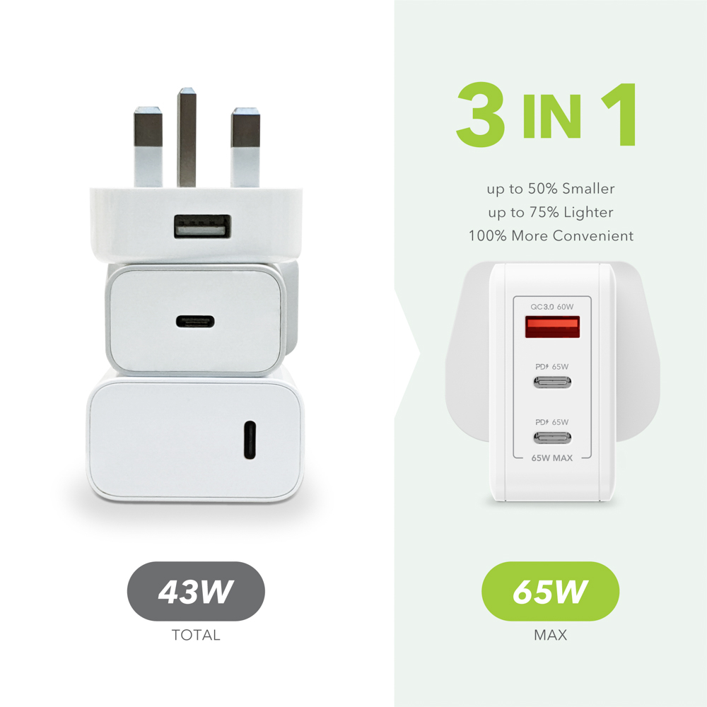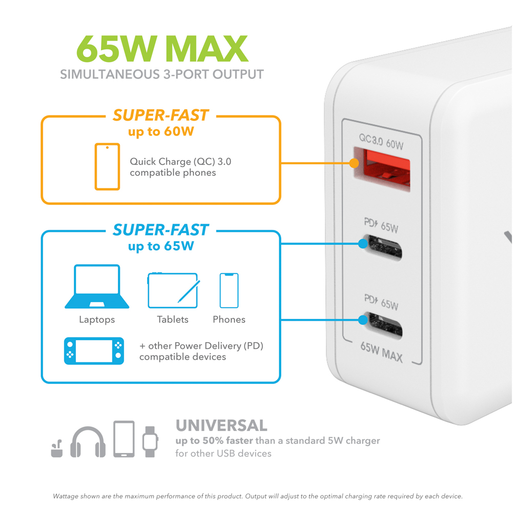 The Gallium Nitride (GaN) chip allows VHG65JW to be smaller and more energy efficient than regular silicon-based chargers, making it more cost-effective to charge your devices. The compact size is easy to carry from home to the office or coffee shop – and with 3 ports there’s no need to fight for available power sockets. It’s the ideal versatile charger for your home, business or travel!