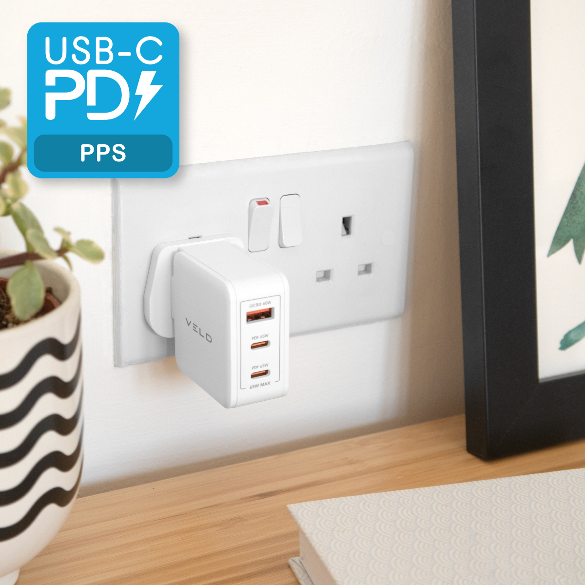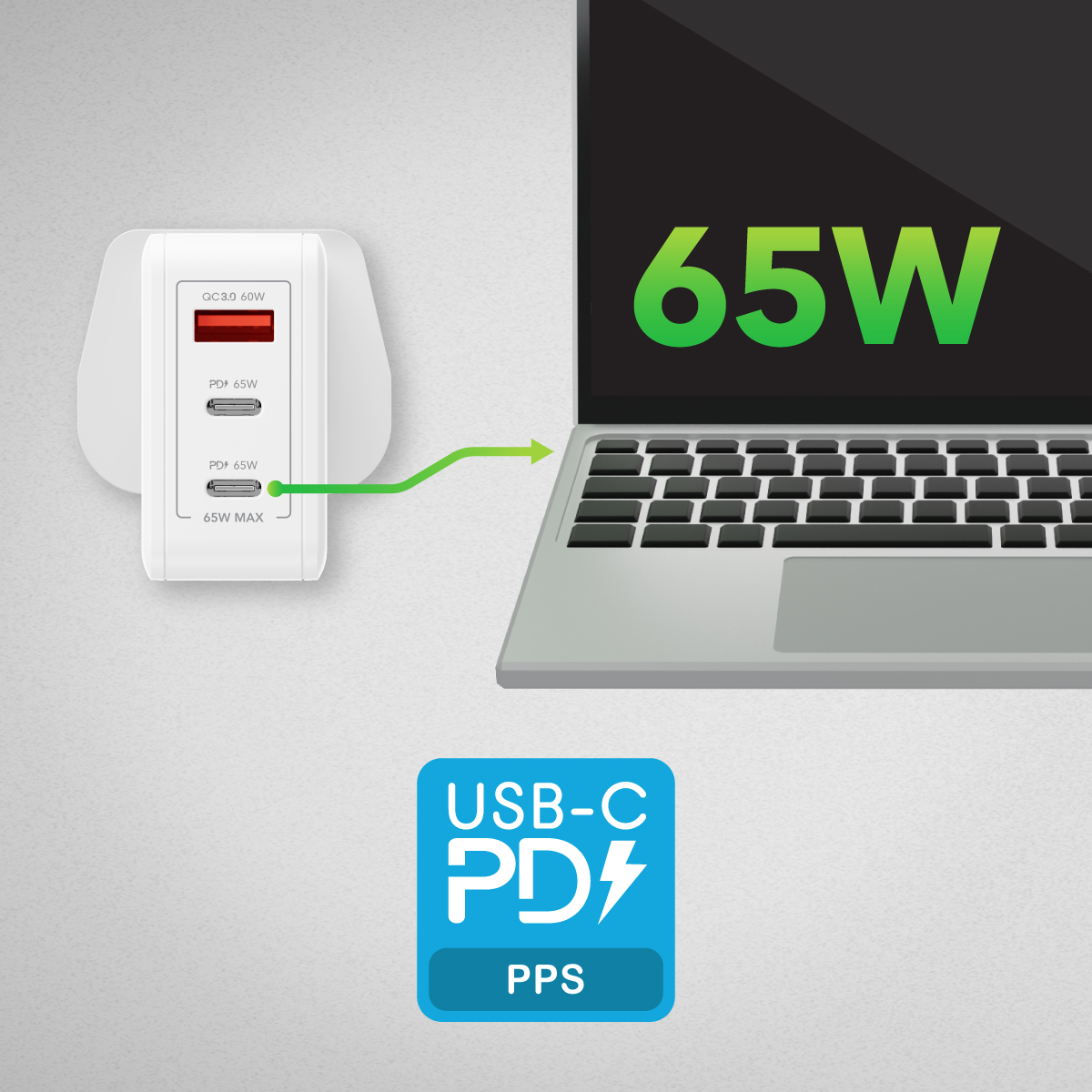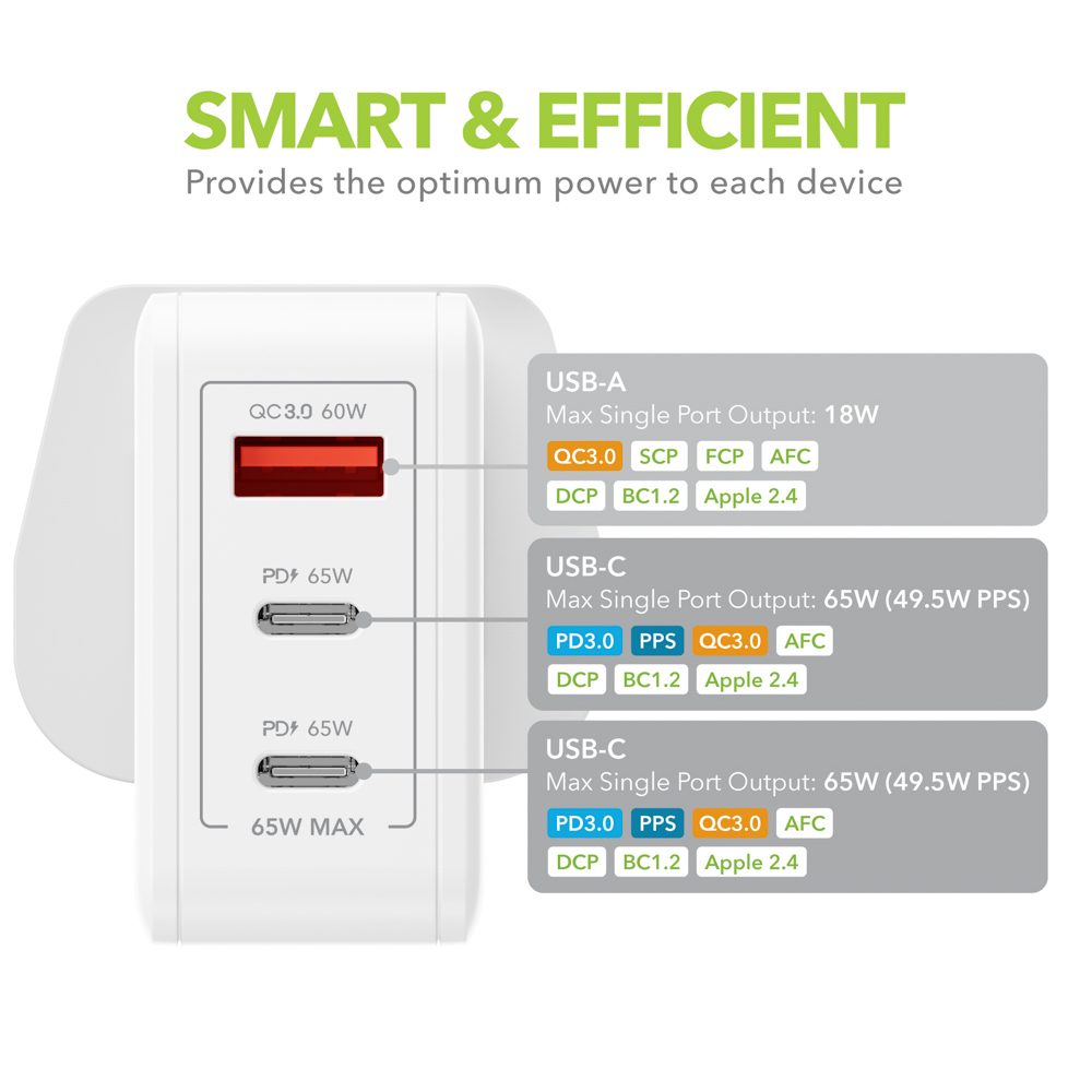 Charge your laptop, tablet and phone, all at once with this super convenient 3 Port PD + PPS Wall Charger, offering super-fast, safe charging up to 65W for phones, tablets, laptops, headphones, and all other USB-C devices – plus fully backwards compatible with older USB powered tech. PPS support allows you to charge the latest phones at the most efficient speeds possible.